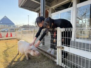 興味津々で遊びに来たので触れ合いをしています! 留学生さんの中には触ったことのない動物もたくさんいたようなので初めて触る動物たちに